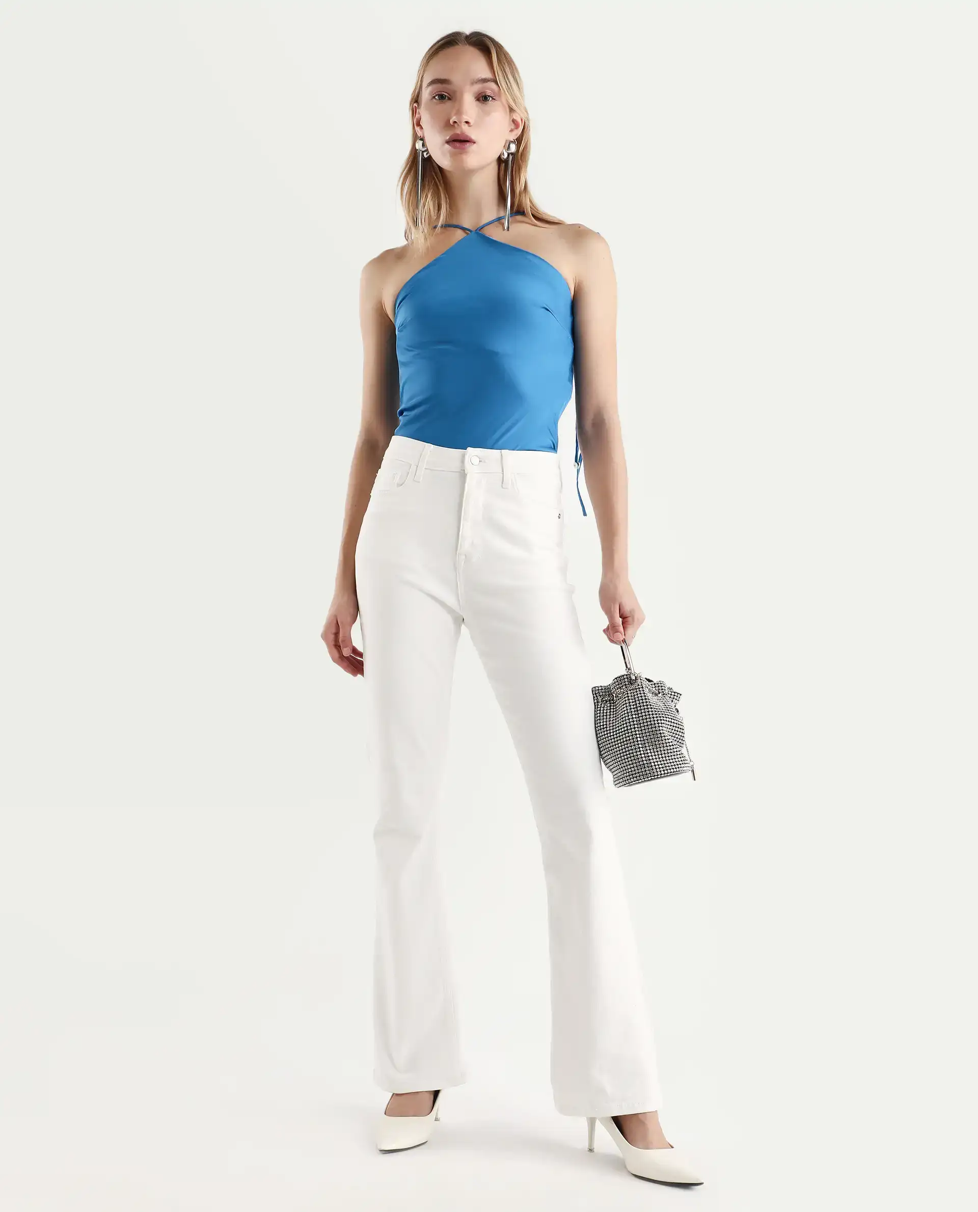 Rareism Women's Bluray Fluorescent Blue Polyester Halter Neck Plain Sleeveless Regular Fit Top