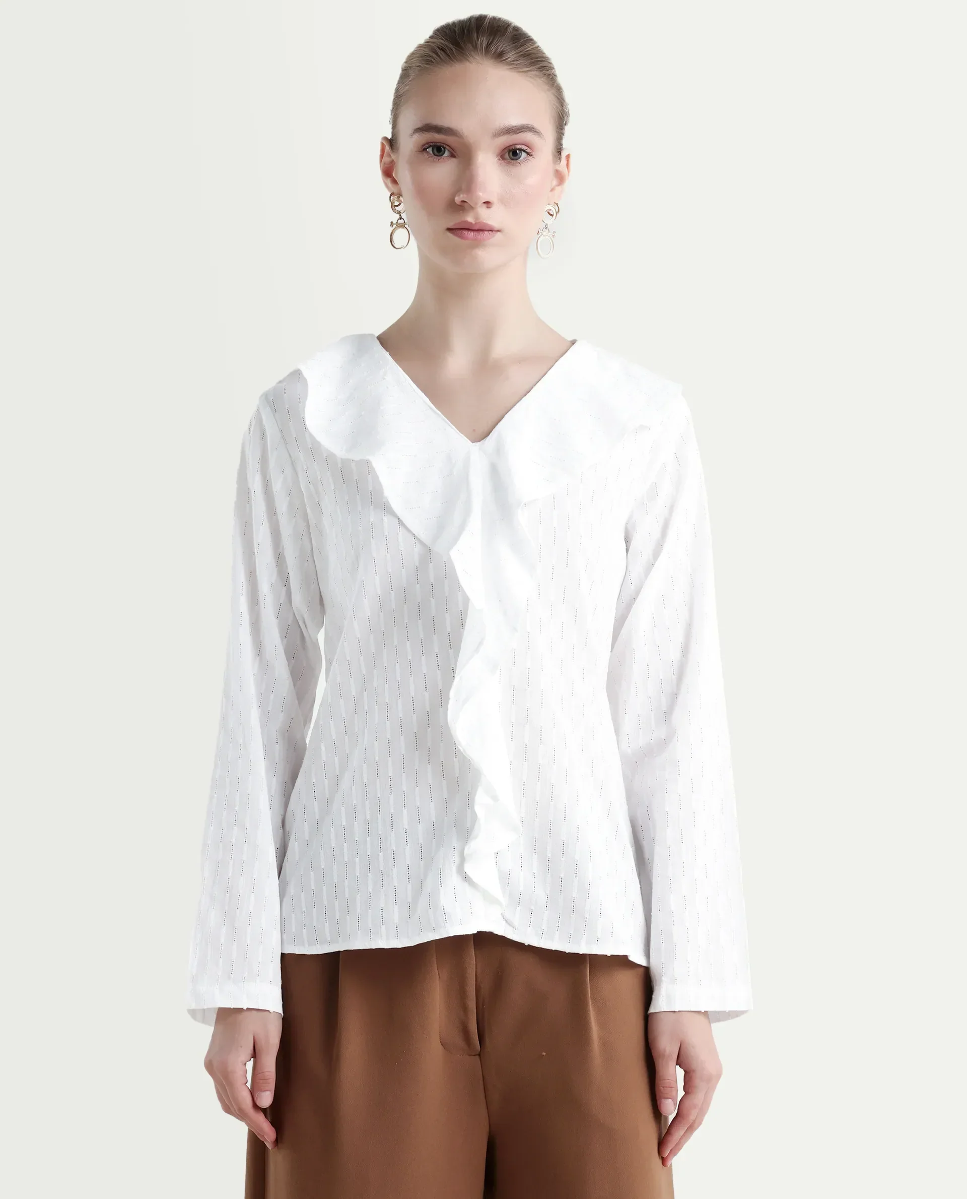Rareism Women's Bowez White Cotton Ruffled Neck Plain Regular Fit Top