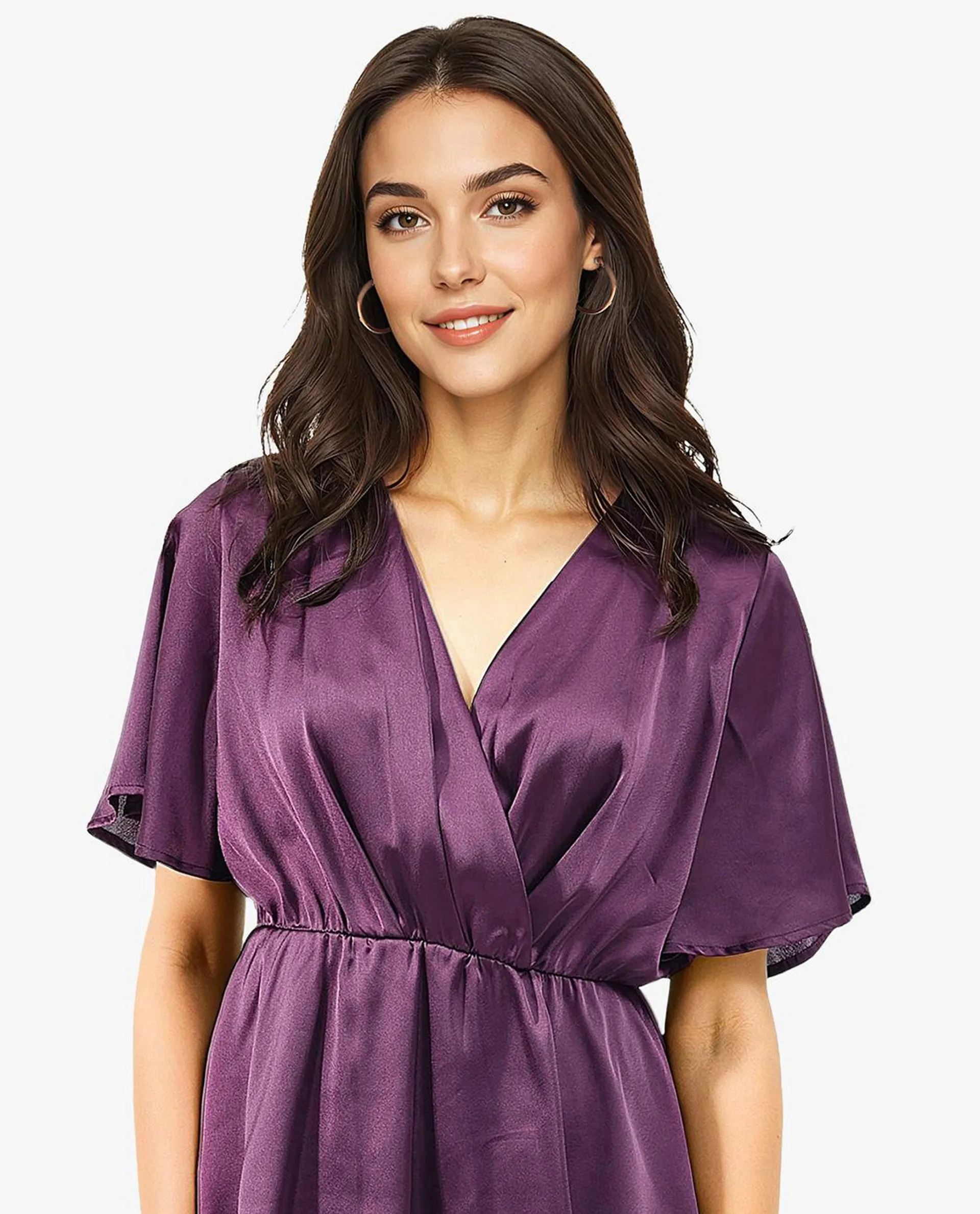 Rareism Women Creola Dark Purple Polyester Fabric Overlap Neck Mini Dress