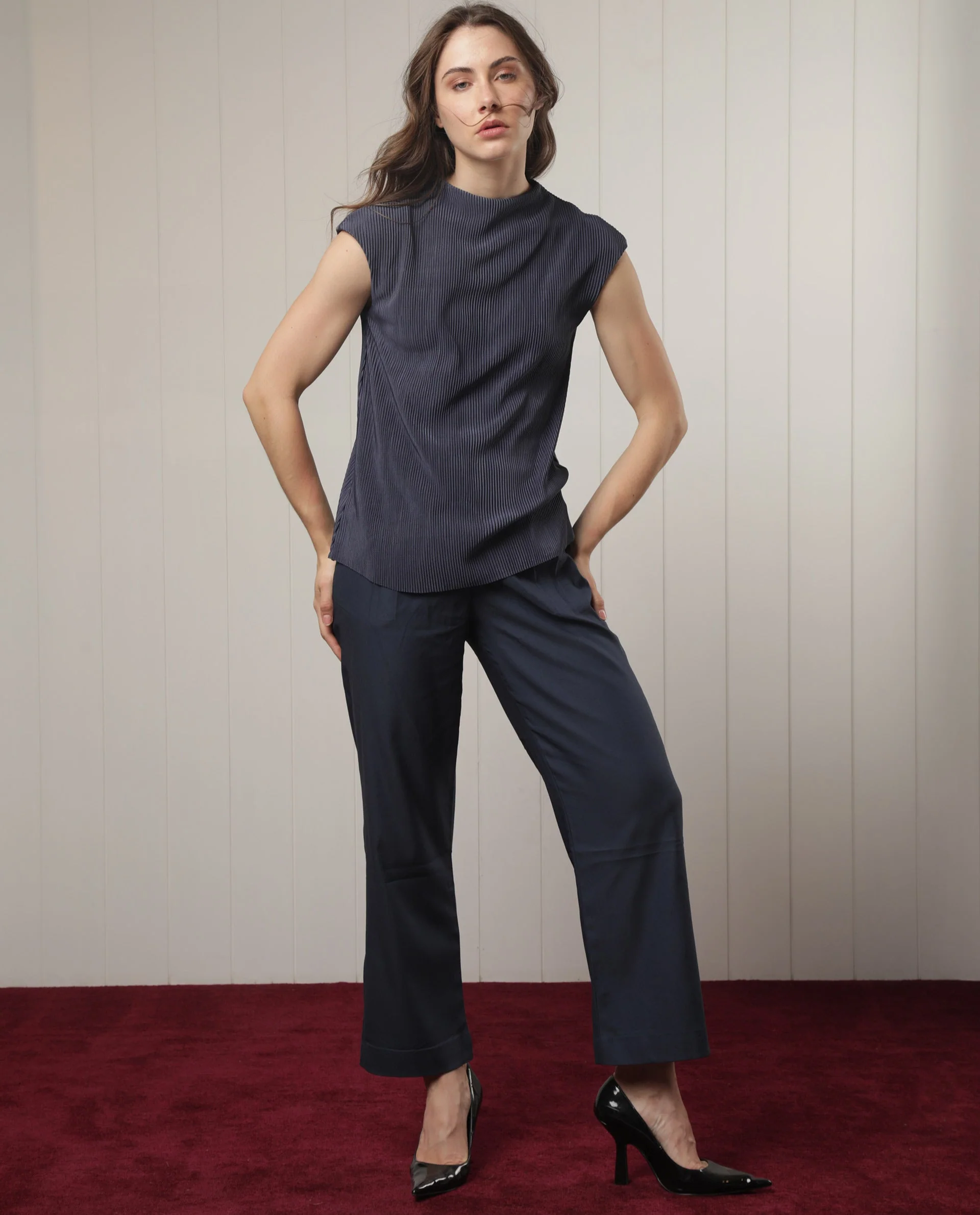 Rareism Women's Daffo Navy Polyester High Neck Textured Sleeveless Relaxed Fit Top
