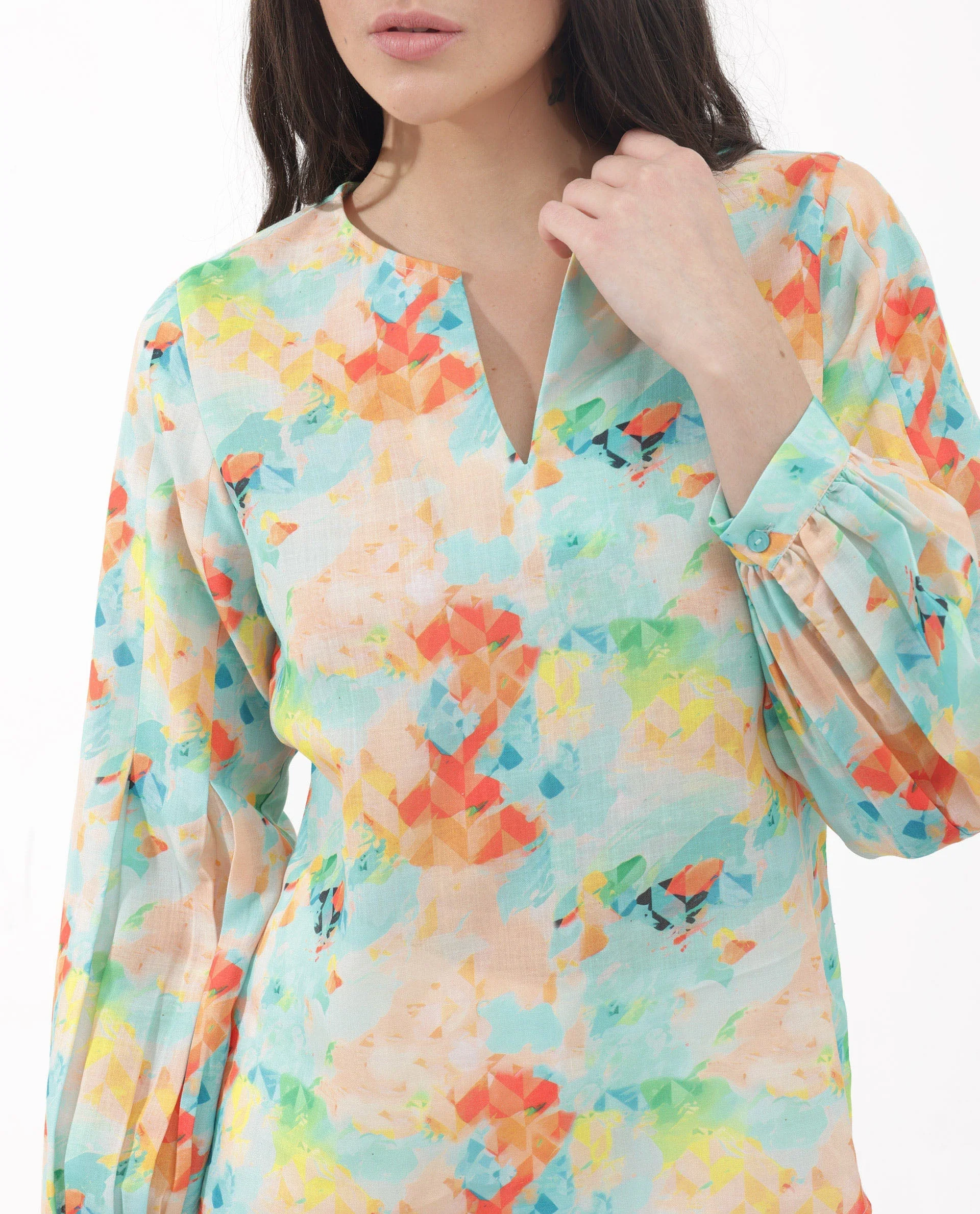 Rareism Women Deimos Flouroscent Multi Linen Fabric Full Sleeve V-Neck Button Closure Geometric Print Regular Fit Top