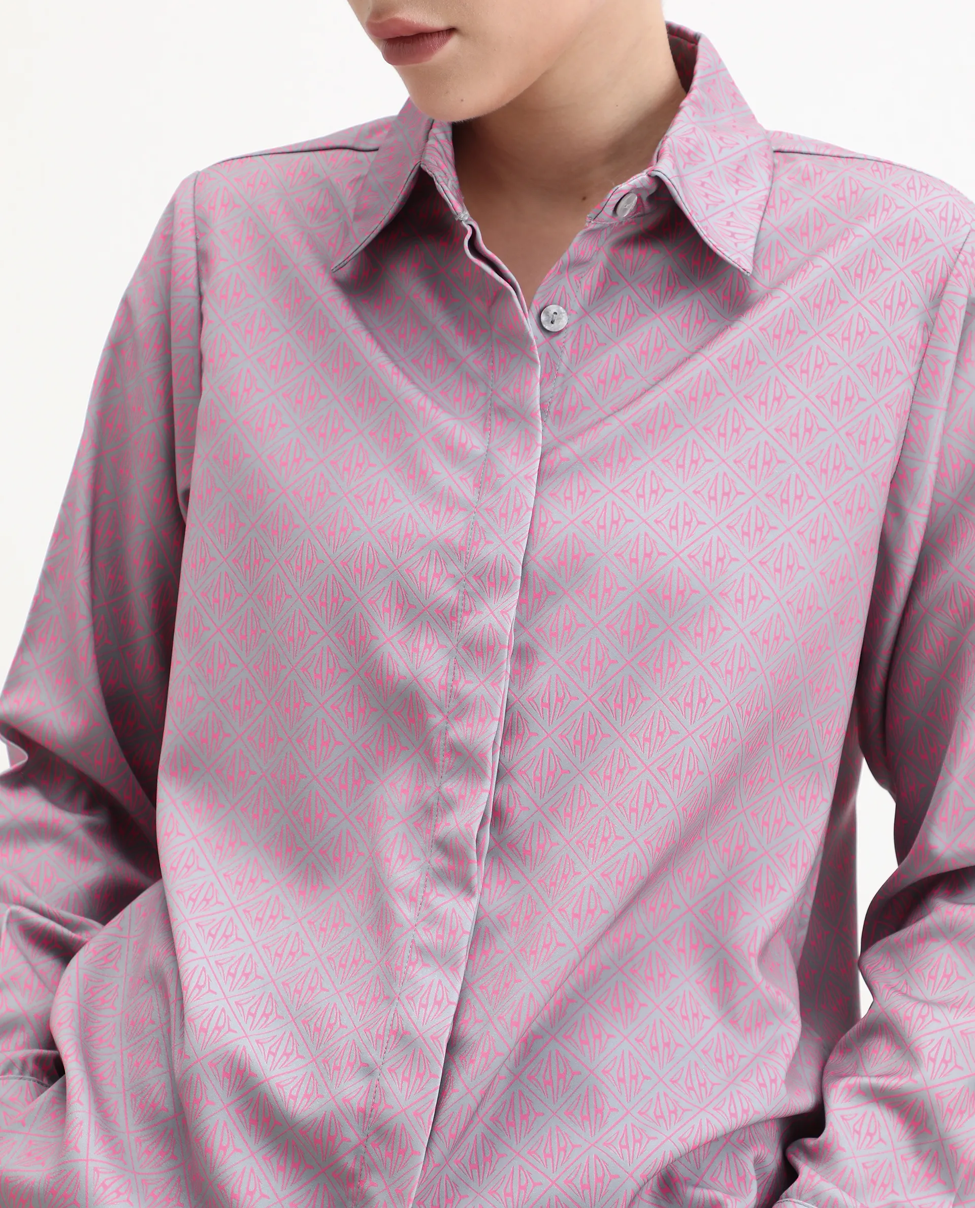 Rareism Women's Korre Pink Satin Spread Collar Monogram Print Cuffed Sleeve Boxy Fit Top