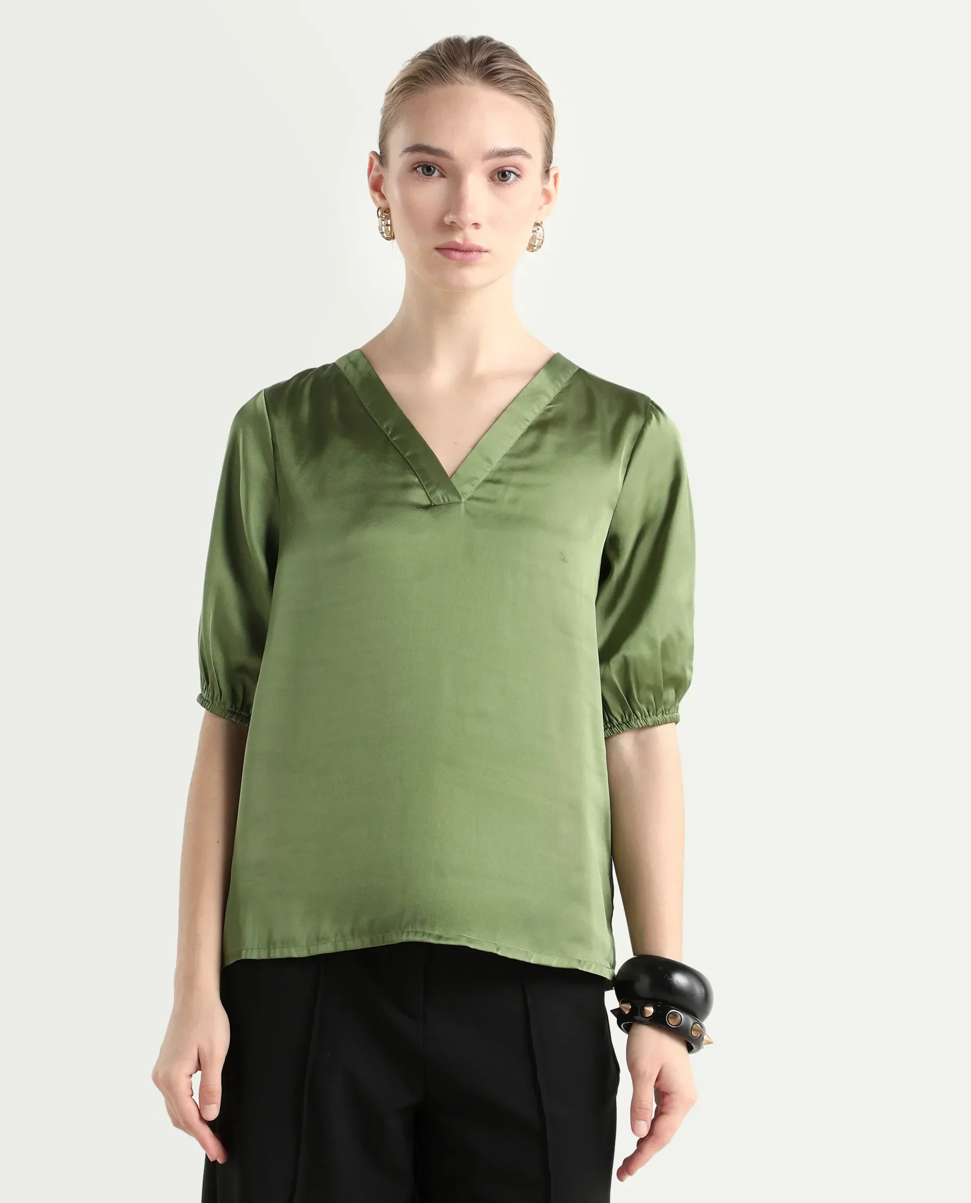 Rareism Women's Linus Dark Green Polyester V-Neck Plain Extended Sleeves Regular Fit Top