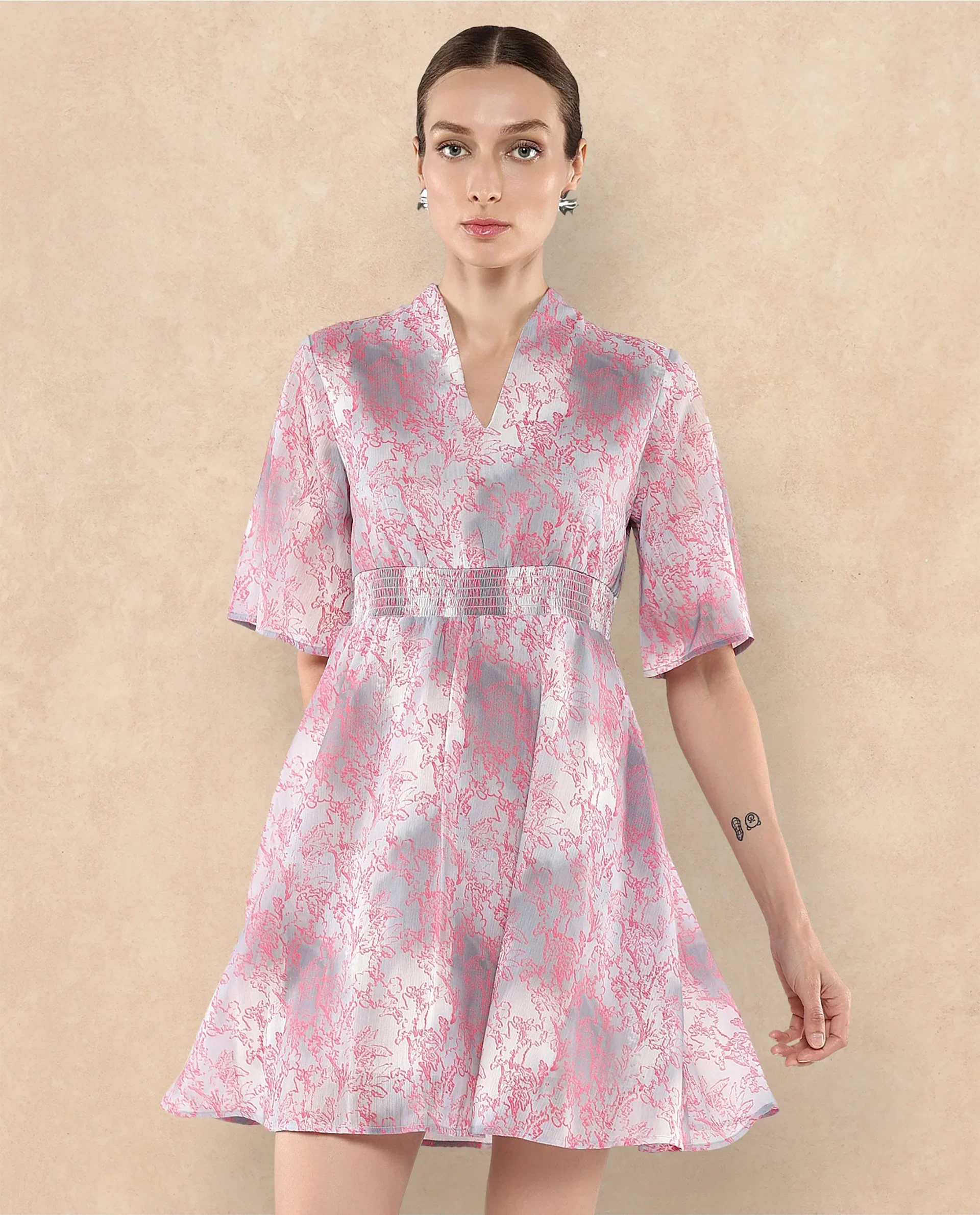 Rareism Women's Luffy Grey Satin Built-Up Neck Abstract Print Flared Sleeve Knee Length Fit And Flare Dress
