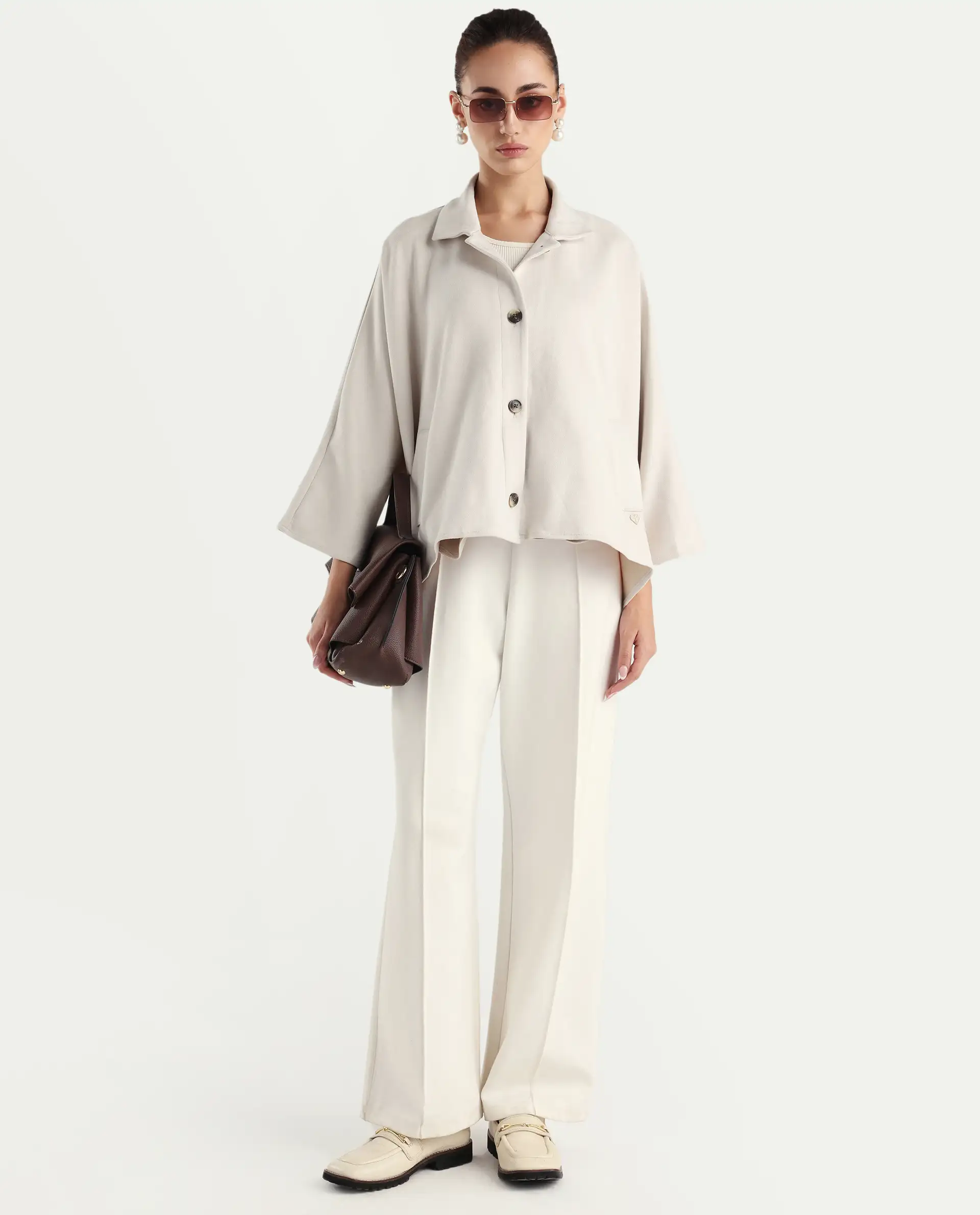 Rareism Women's Macqua Light Beige Suede Spread Collar Plain Boxy Fit Jacket