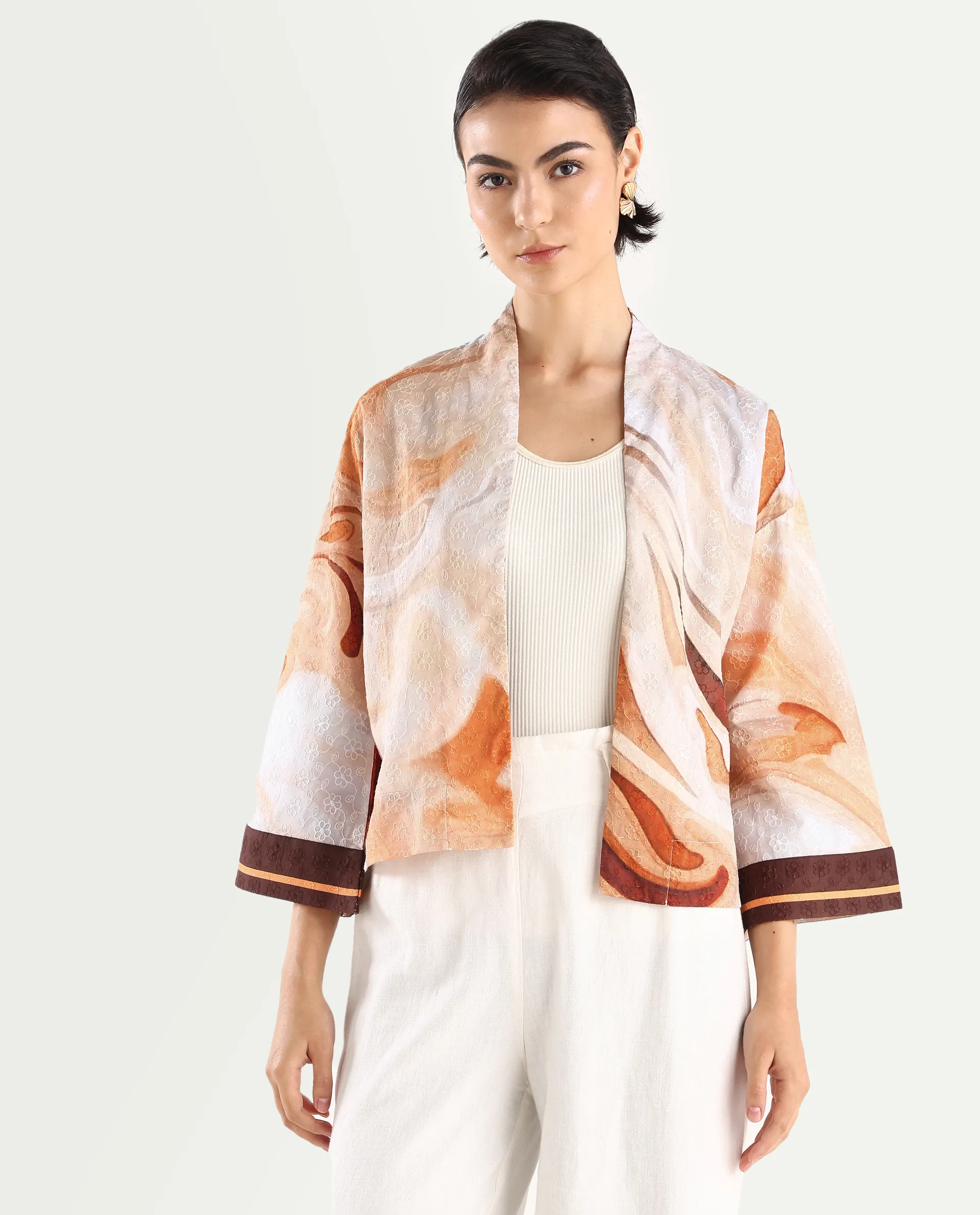 Rareism Women's Modena Light Brown Cotton Shawl Collar Abstract Print Bell Sleeve Crop Regular Fit Top