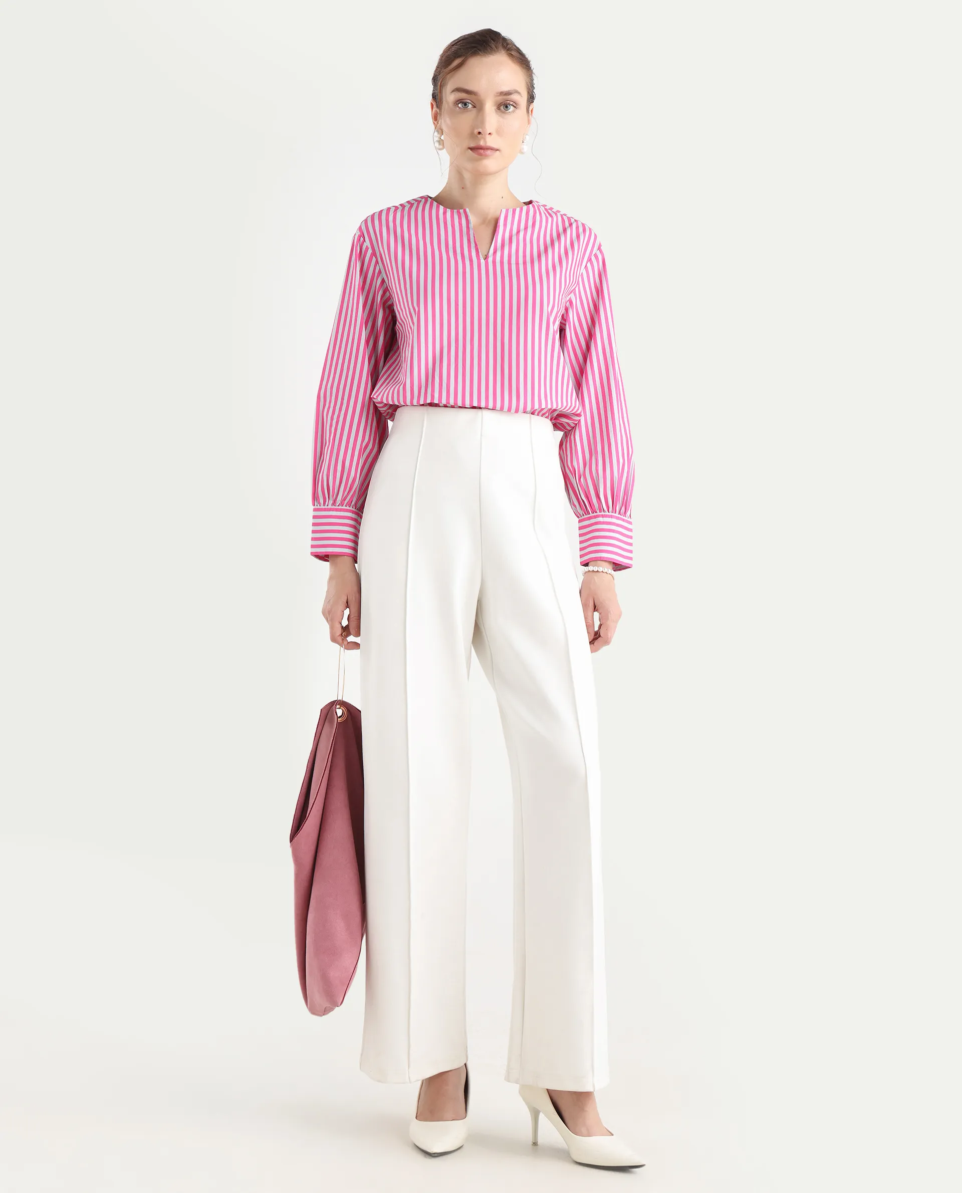 Rareism Women's Myrto Pink Cotton Crew Neck Striped Cuffed Sleeve Regular Fit Top—