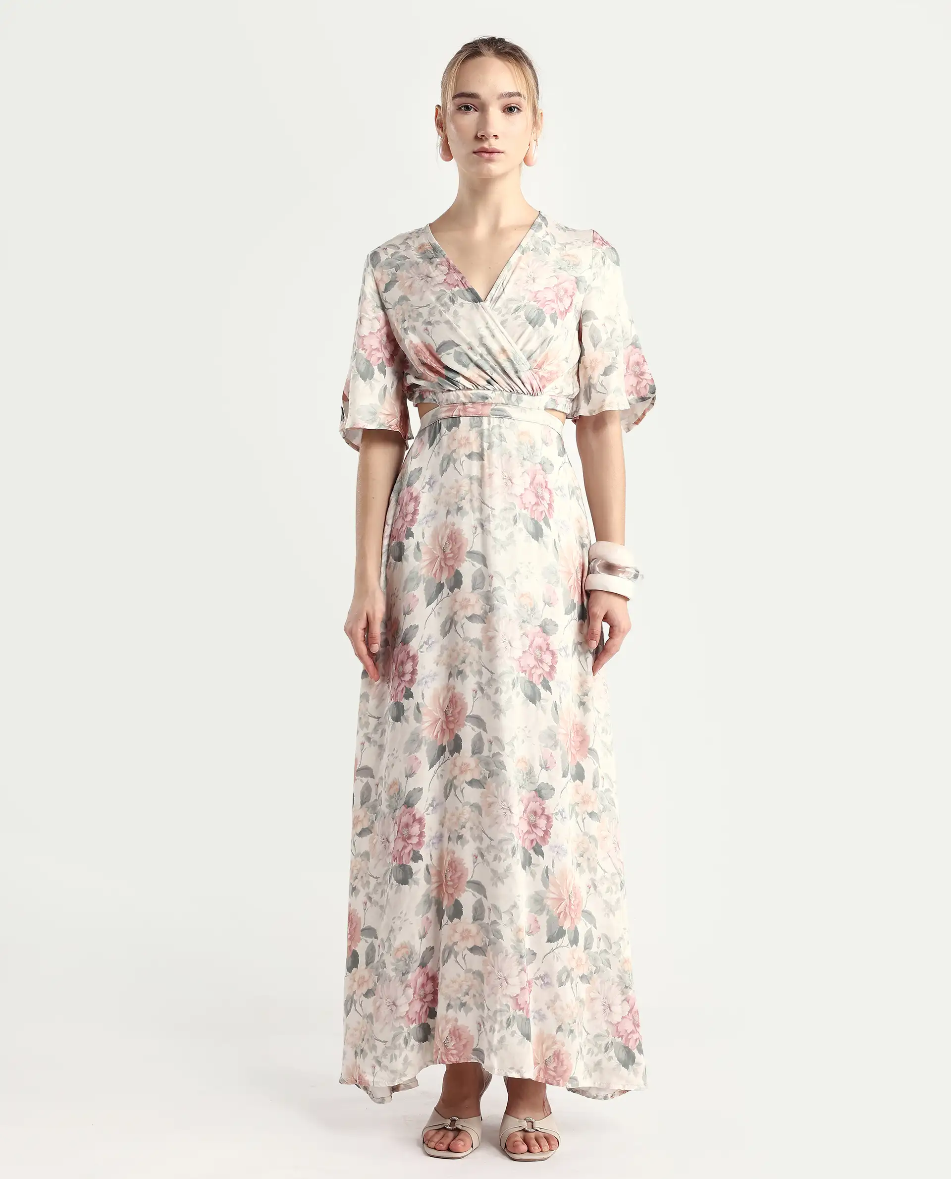 Rareism Women's Ravin Multi Cotton Blend Overlap Neck Floral Print Maxi Fit And Flare Dress