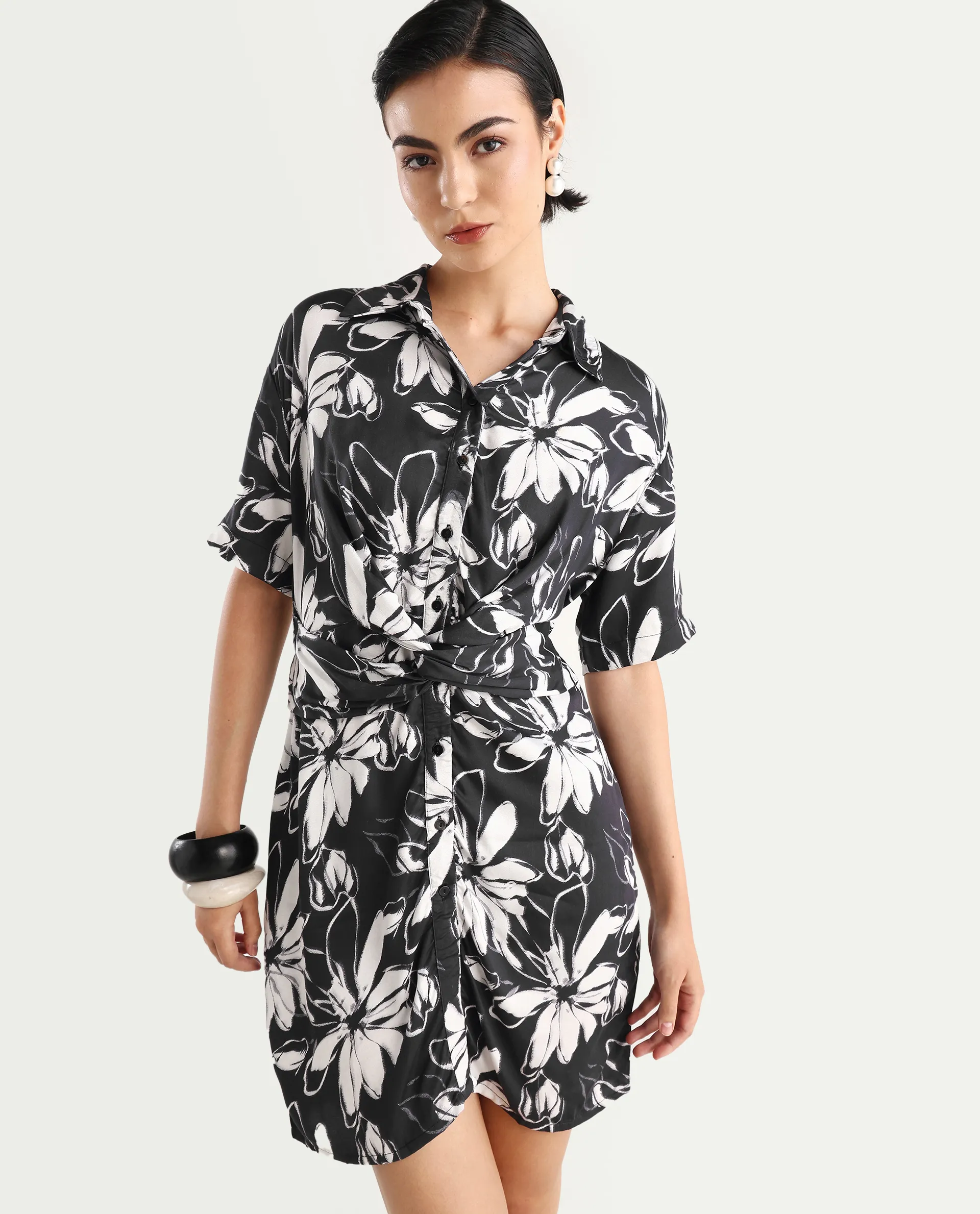 Rareism Women's Saltillo Black Cotton Blend Drop Collar Floral Print Mini Regular Fit Dress