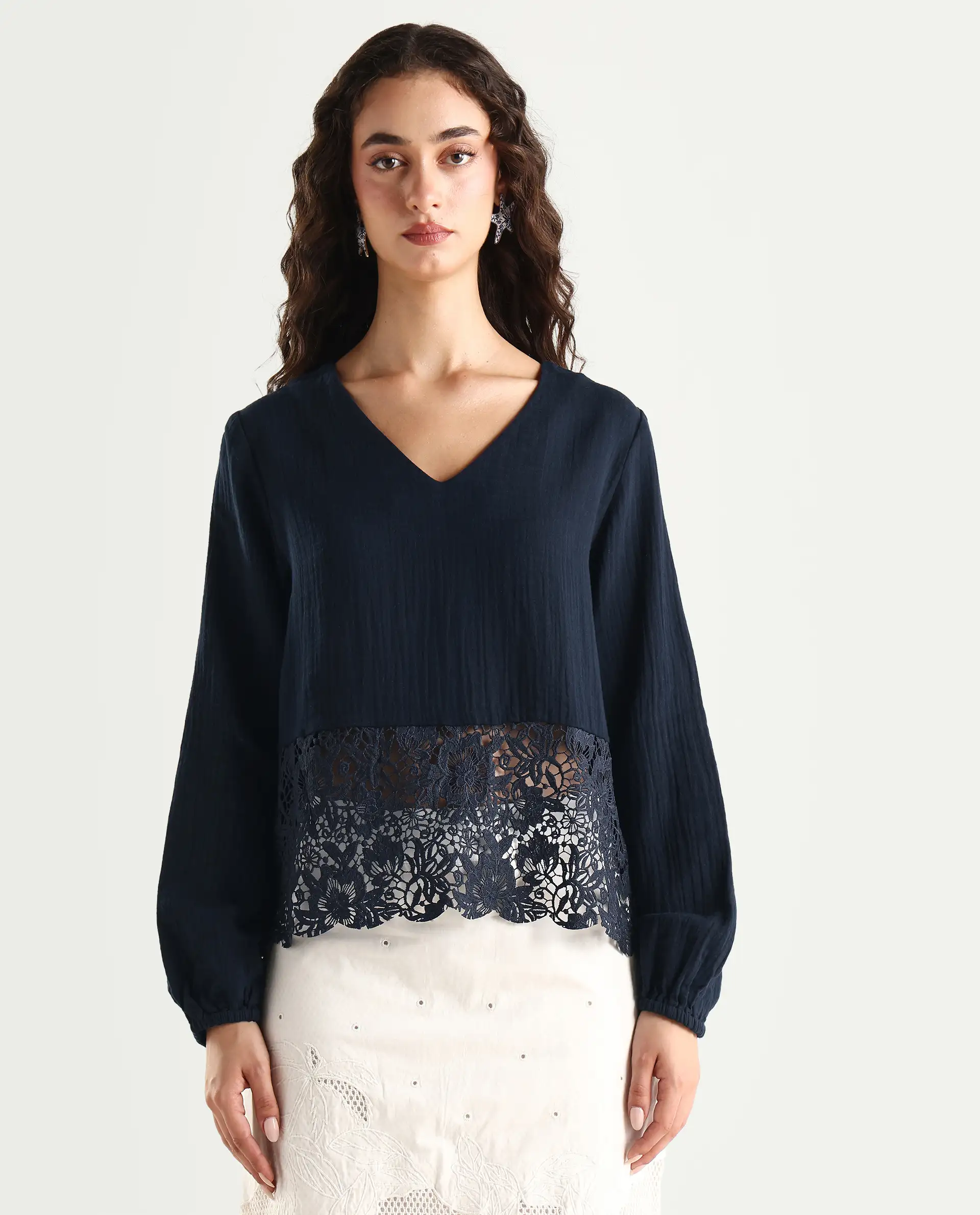Rareism Women's Sinloao Navy Cotton V-Neck Plain Bishop Sleeve Regular Fit Top