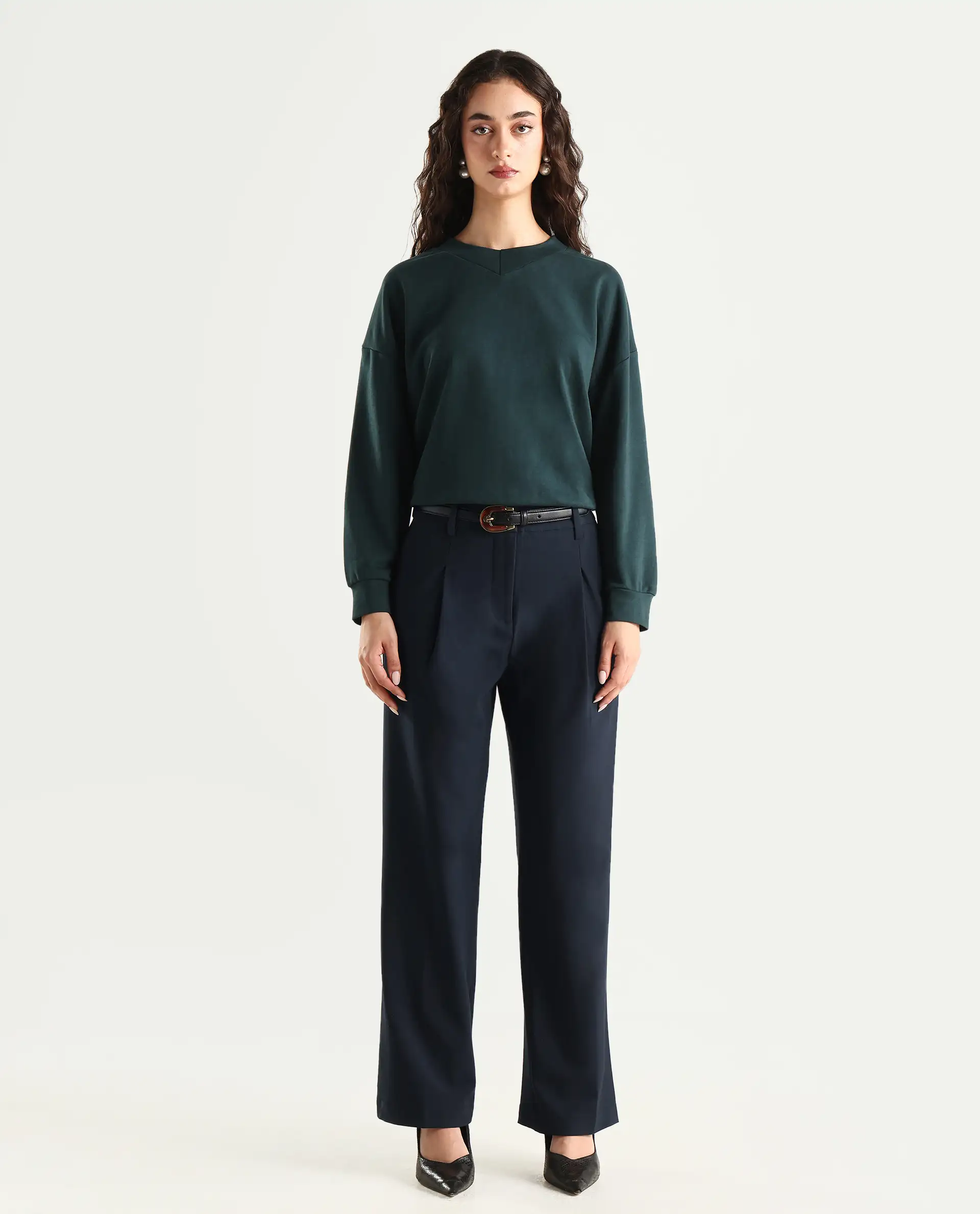 -70%Rareism Women's Tatsa Navy Polyester Blend Plain Ankle Length Straight Fit Trouser—