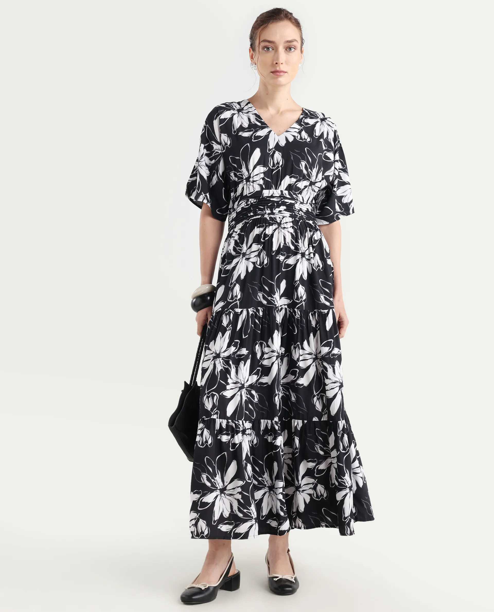 Rareism Women's Tuzio Black Viscose V-Neck Floral Print Extended Sleeves Maxi Fit And Flare Dress