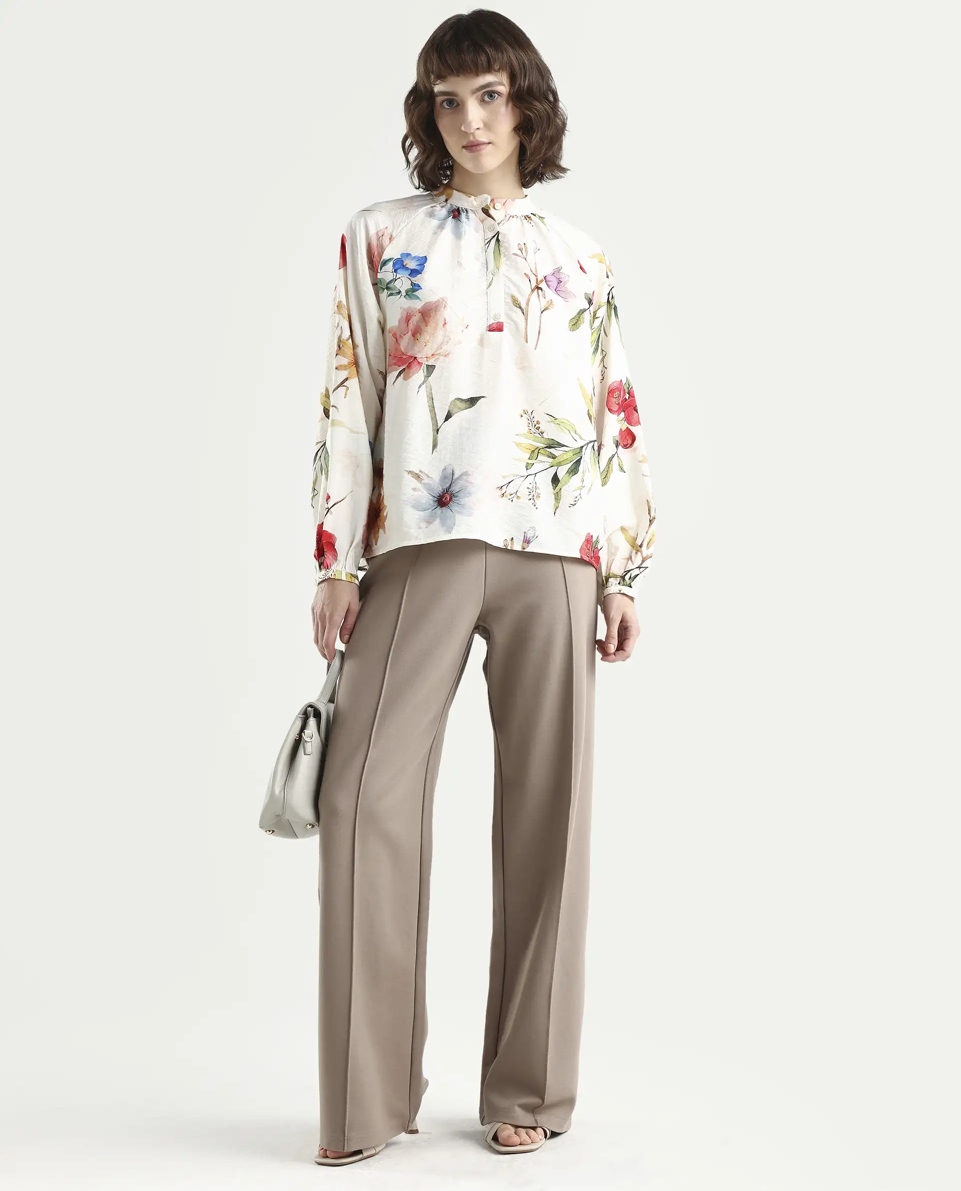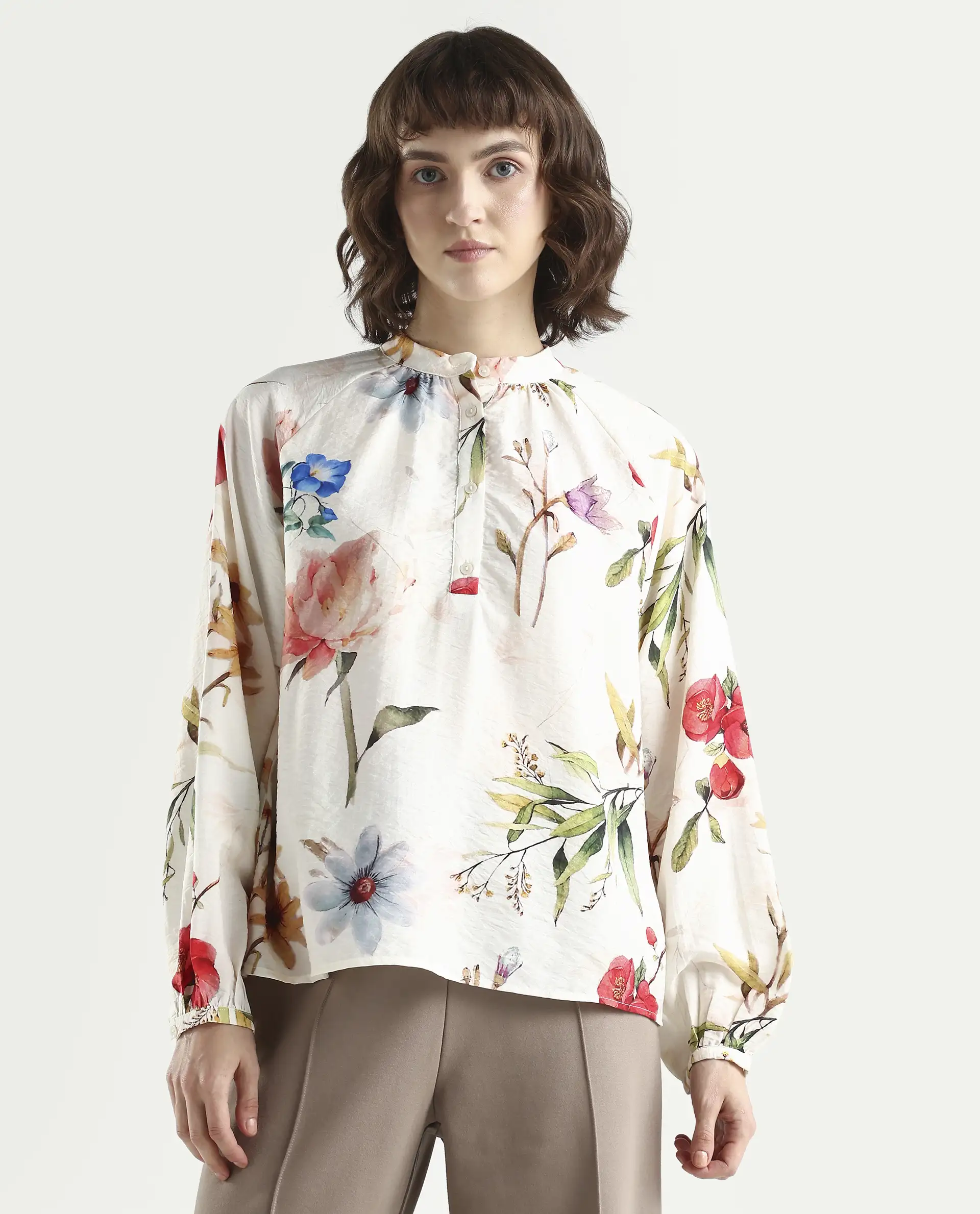 Rareism Women's Valia Off White Viscose Blend Full Sleeve Relaxed Fit Floral Print Top