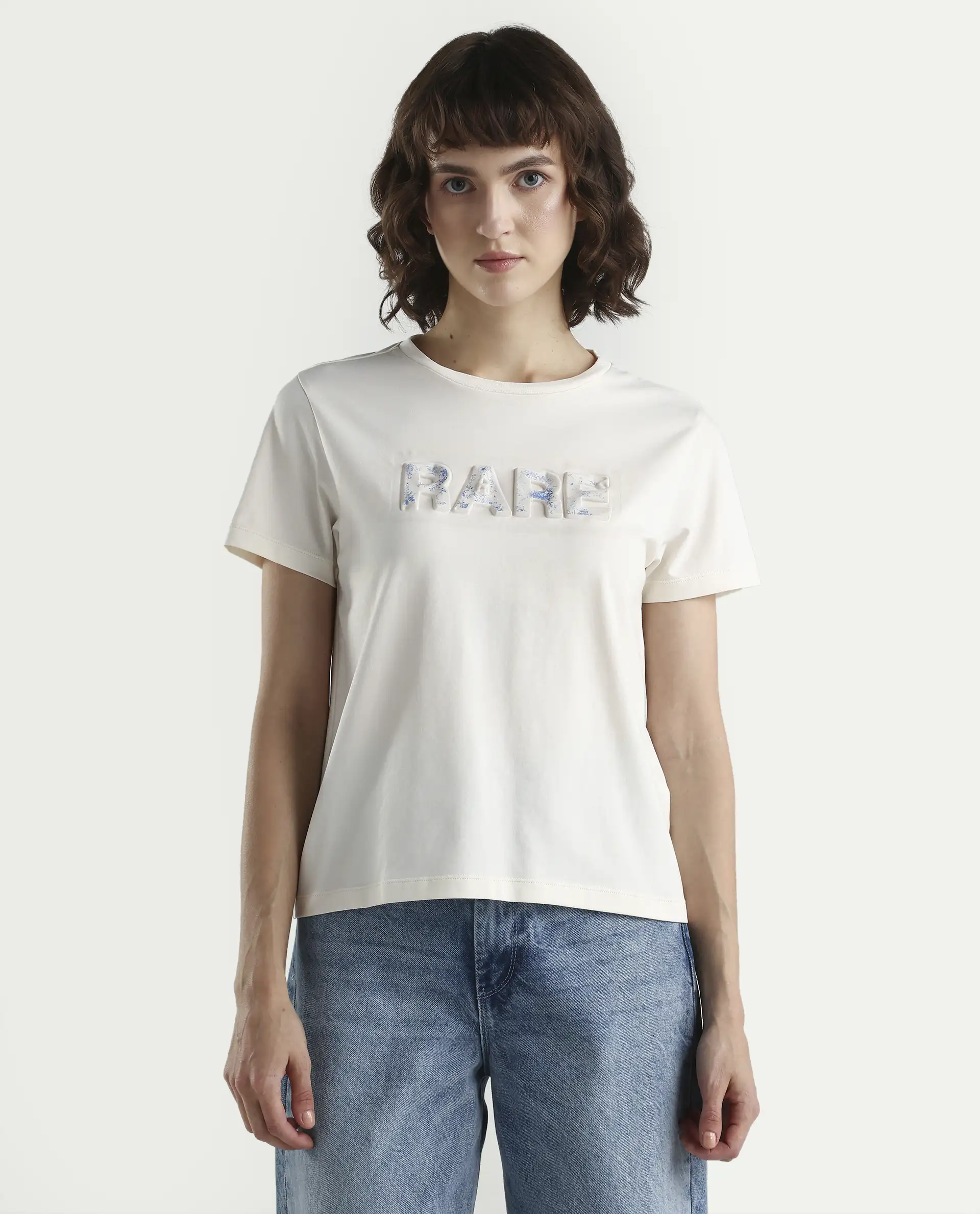 Embrace effortless elegance with this versatile women's t-shirt, crafted from a premium cotton blend that balances breathability with durability. The off-white hue serves as a neutral canvas, while the thoughtfully designed print adds visual interest without overwhelming your wardrobe. Cut in a regular fit silhouette with half sleeves, it transitions seamlessly from casual weekends to relaxed workdays. The fabric's natural composition ensures comfort throughout extended wear, making it an essential layering piece or standalone staple. Perfect for those who value quality basics that deliver both style and substance.