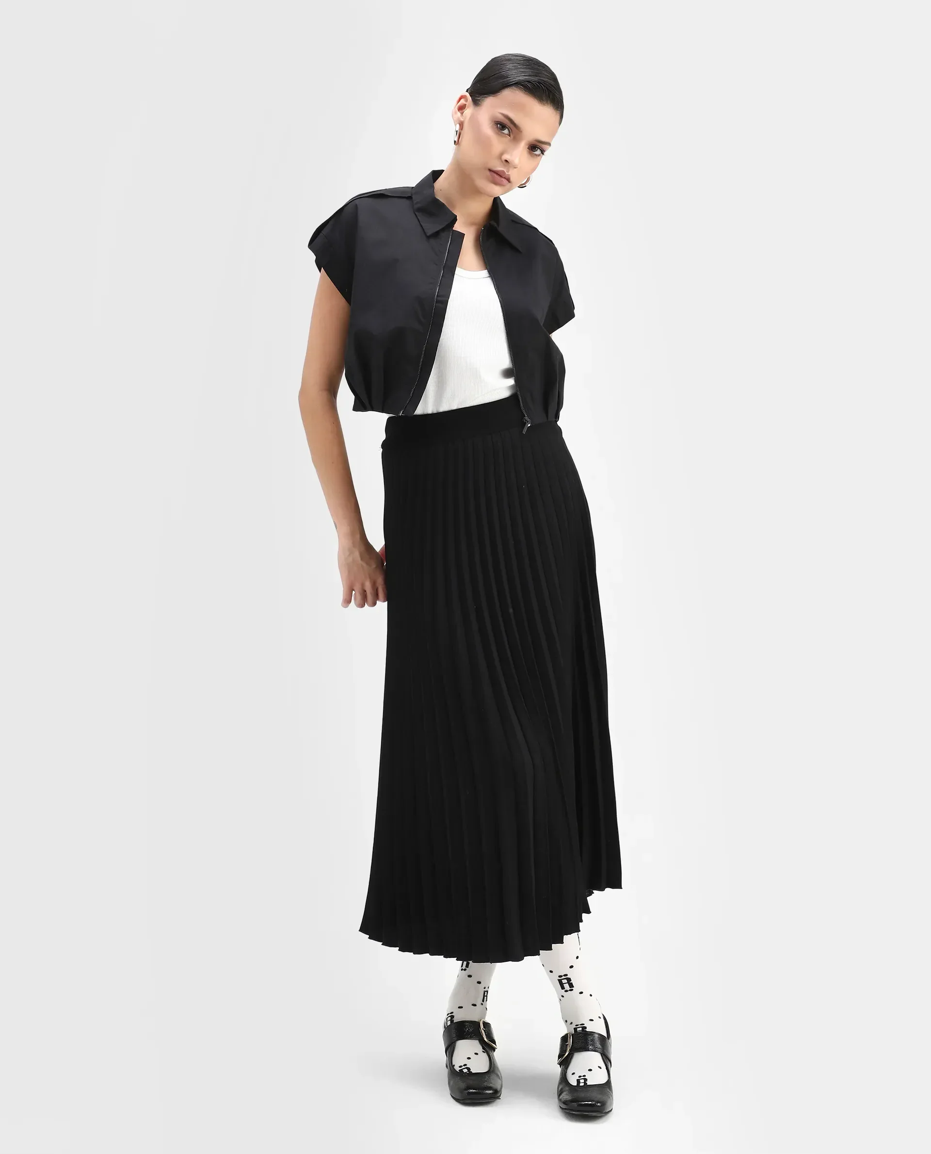 Rareism Women's Zuckery Black Cotton Blend Drop Collar Plain Extended Sleeves Crop Regular Fit Top