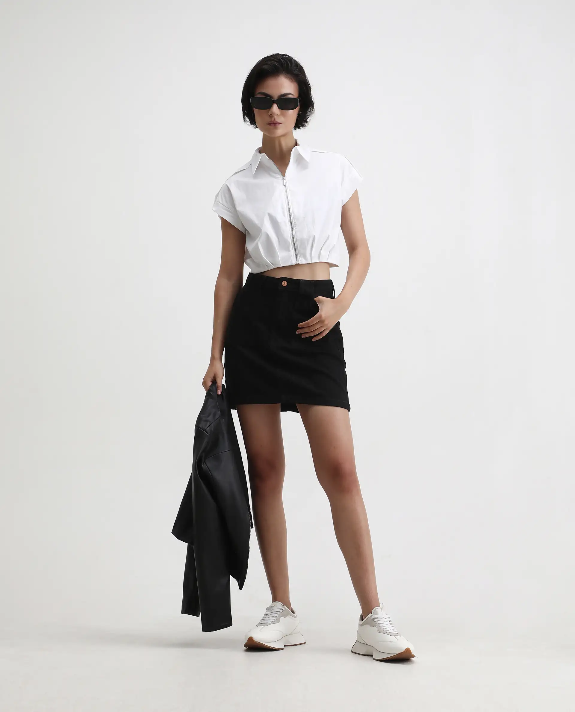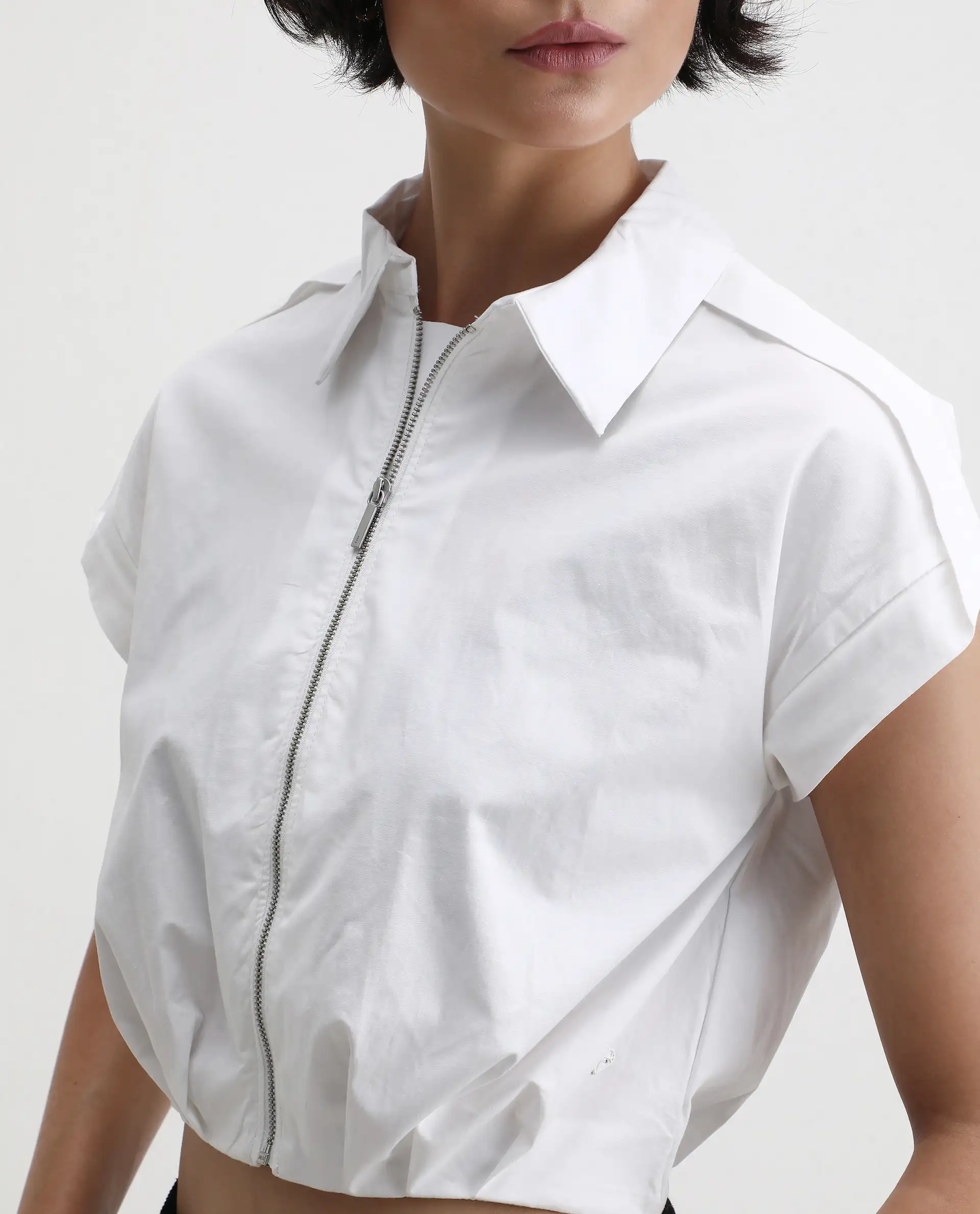 Rareism Women's Zuckery White Cotton Blend Drop Collar Plain Extended Sleeves Crop Regular Fit Top
